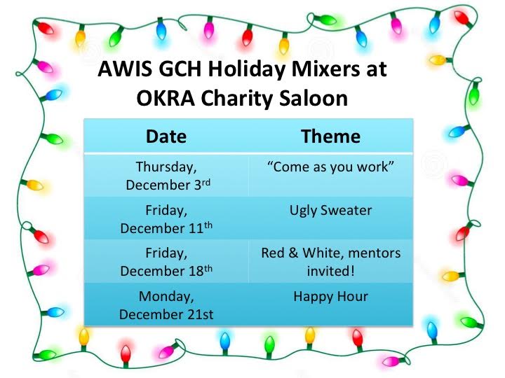 We will be holding several networking Holiday Mixers throughout the month at OKRA. Come join us and vote for AWIS!