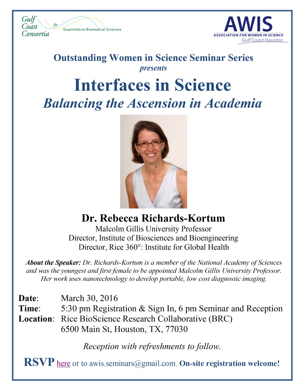 About the speaker: Dr. Richards-Kortum is a member of the National Academy of Sciences and was the youngest and first female to be appointed Malcolm Gillis University Professor. Her work uses nanotechnology to develop portable, low cost diagnostic imaging.