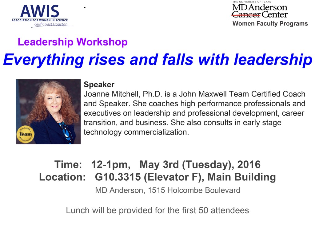 You are cordially invited to attend a 1-hour interactive workshop on leadership led by professional career coach and performance driven woman Dr. Joanne Mitchell entitled “Everything rises or falls with leadership”!