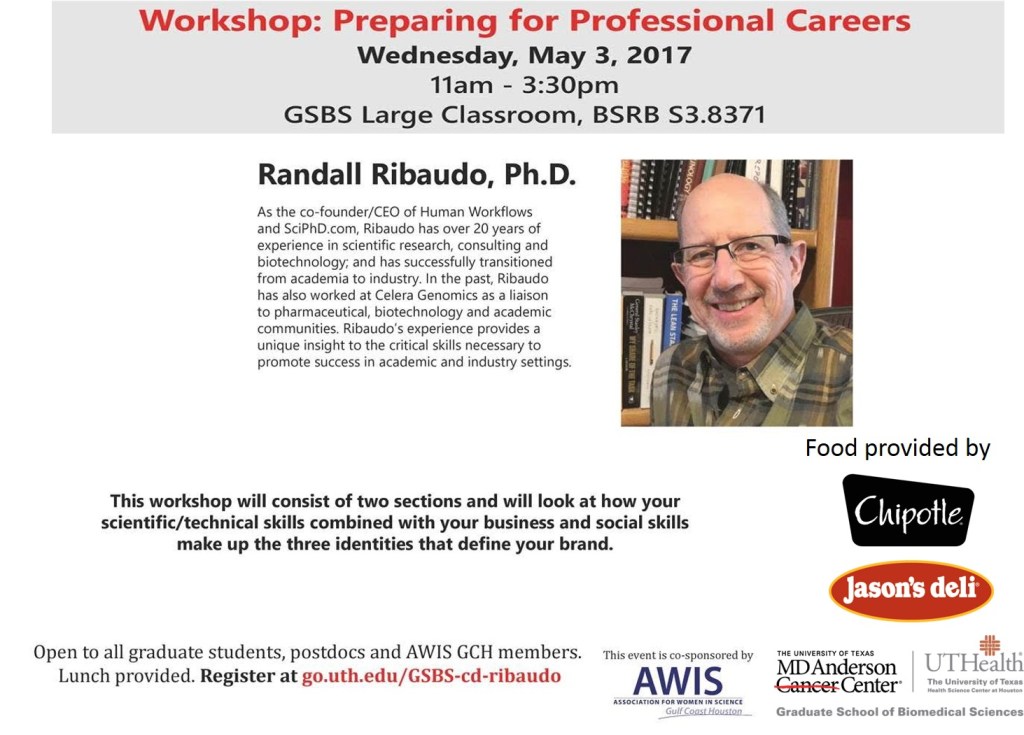 The GSBS Office of Career Development and the Association for Women in Science (AWIS) Gulf Coast Houston will host featured speaker, Randall Ribaudo, PhD, co-founder/CEO of Human Workflows and SciPhD.com on Wednesday, May 3rd for a workshop titled Preparing for Professional Careers from 11 am – 3:30 pm in the GSBS Large Classroom, BSRB S3.8371.
