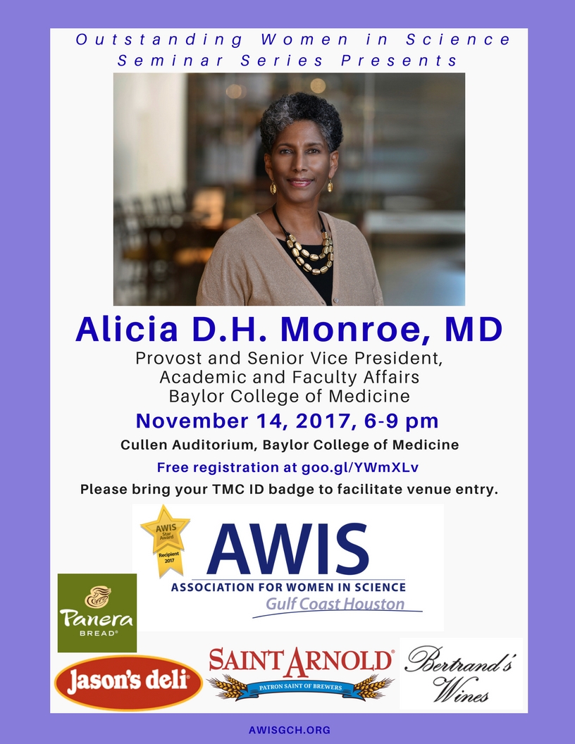 Join us for our Fall 2017 Outstanding Women in Science Seminar Series presenting Dr. Alicia D.H. Monroe, Provost and Senior Vice President, Academic and Faculty Affairs, Baylor College of Medicine!
