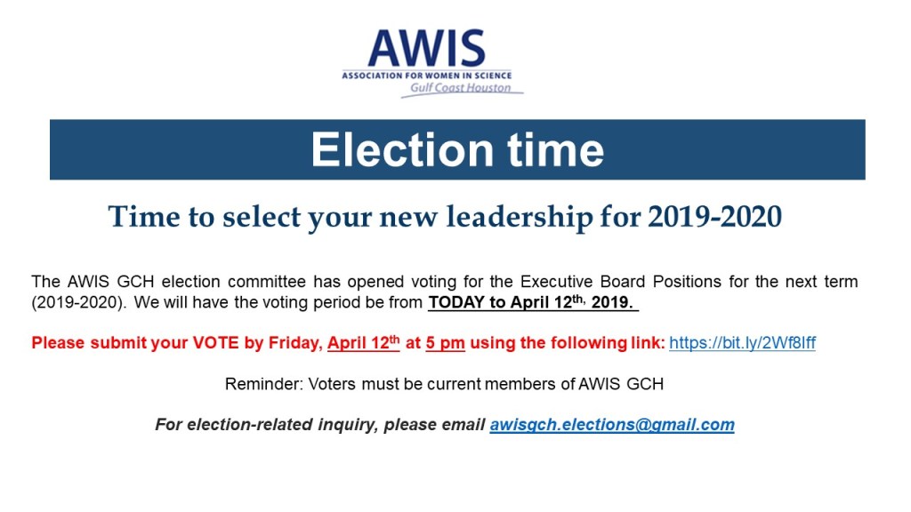 The AWIS GCH Election Committee has opened voting for Executive Board Positions for the upcoming 2019-2020 term. Voting will be open until April 12, 2019.