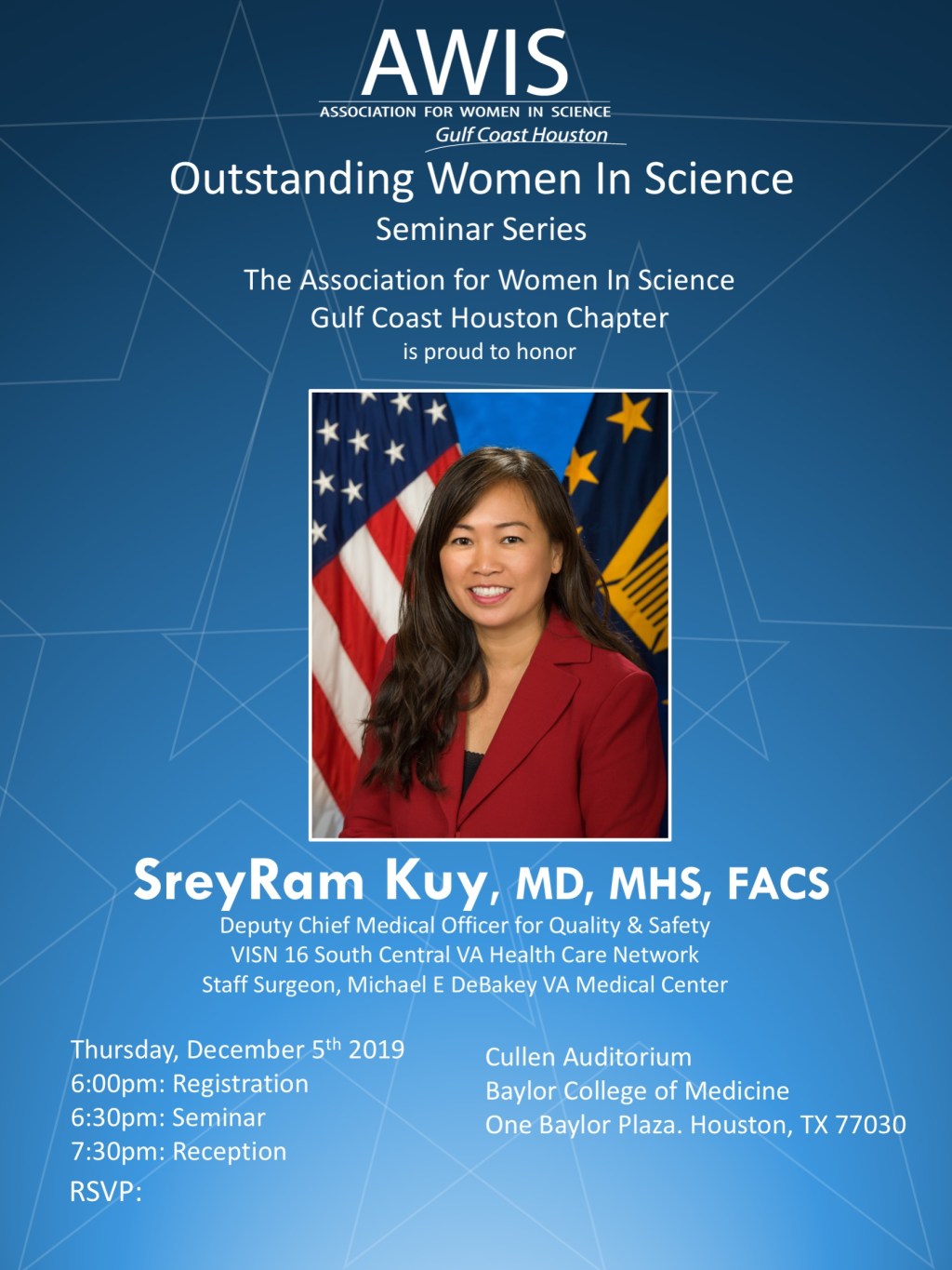 Join us for our Fall 2019 Outstanding Women in Science Seminar Series presenting SreyRam Kuy, MD, MHS, FACs, Deputy Chief Medical Officer for Quality & Safety and Surgeon, Michael E. DeBakey VA Medical Center.