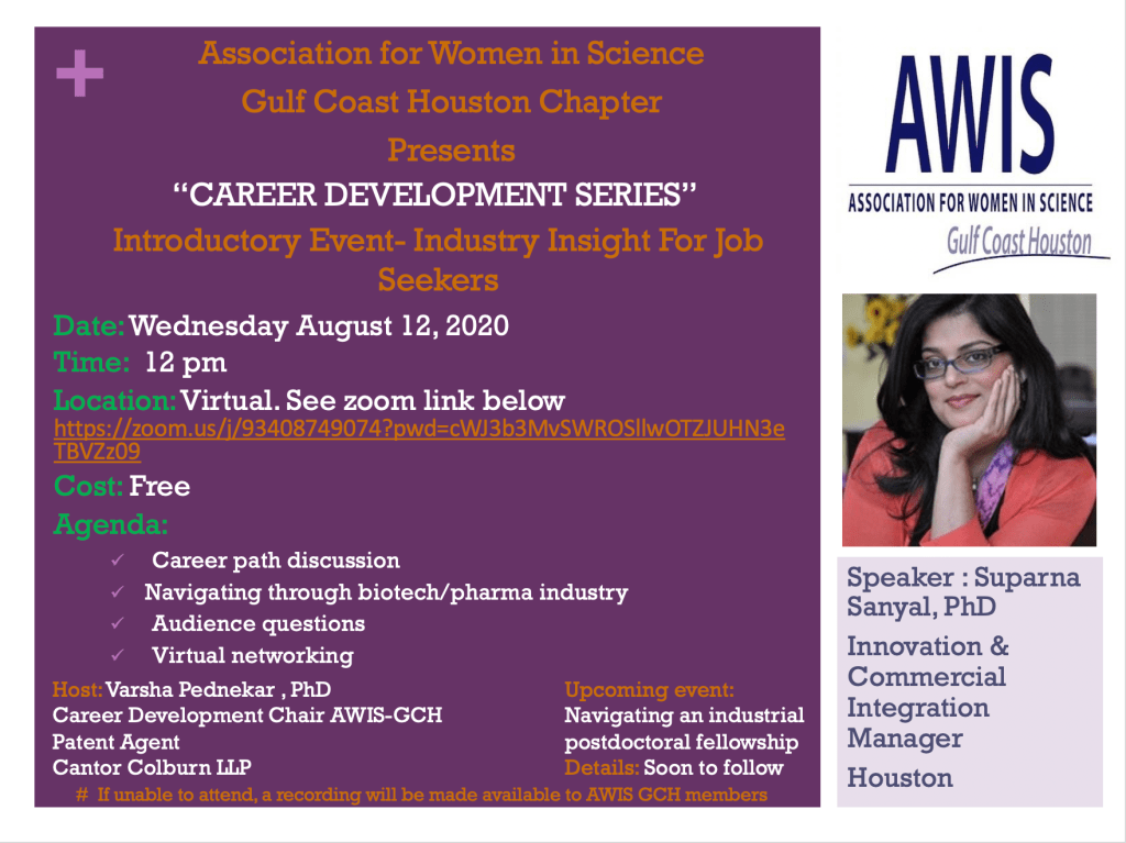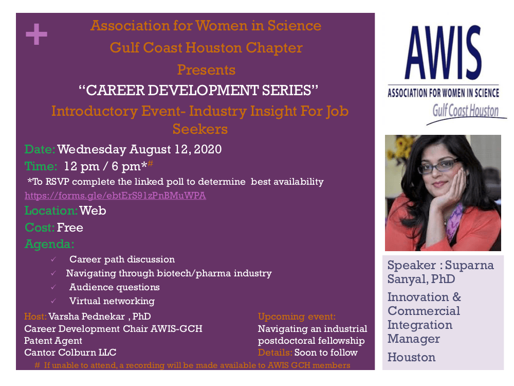 Our introductory event on Wednesday, August 12th features Dr Suparna Sanyal , Innovation and Commercial Integration Manager, from the Houston area.