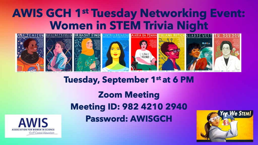 Join us Tuesday, September 1st at 6 PM for our 1st Tuesday Virtual Networking event. This month, our networking event will be a Women in STEM trivia night. We’ll split into teams and get started at 6:15, but don’t worry if you’re running late, we’ll just add you to a team whenever you can join. We can’t wait to see you!