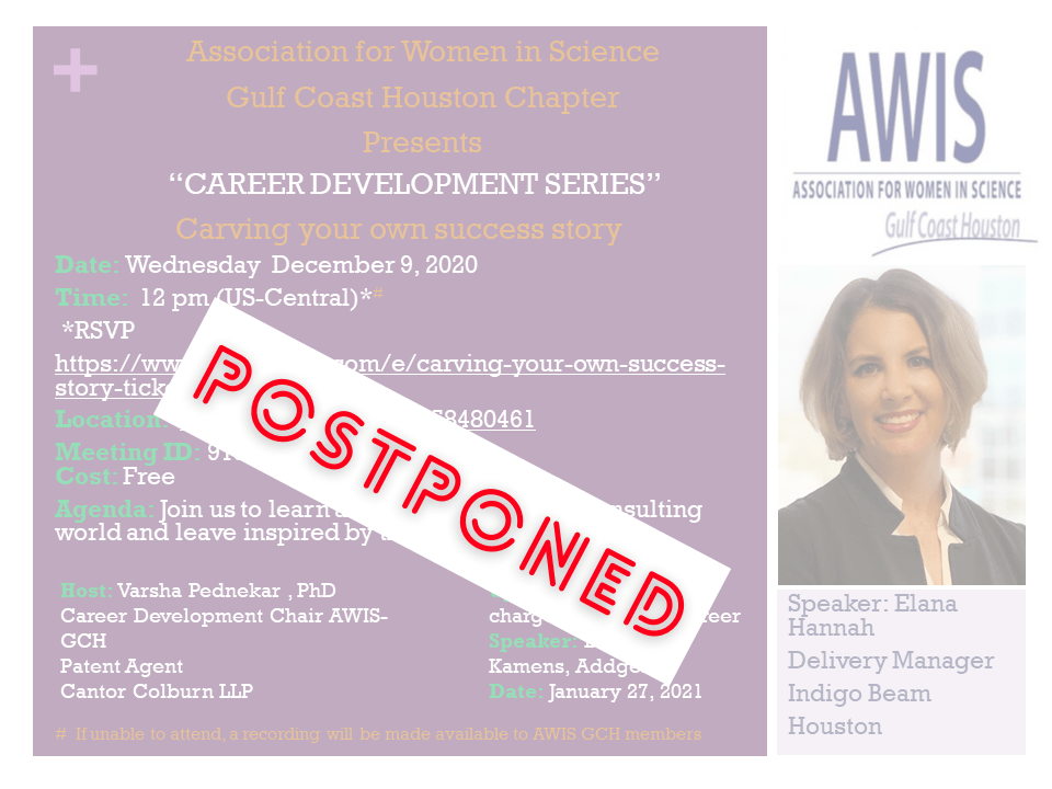 We are postponing the Career Development Series December 2020 Seminar, with host Elana Hannah, to early 2021. Please contact awisgch@gmail.com for questions.