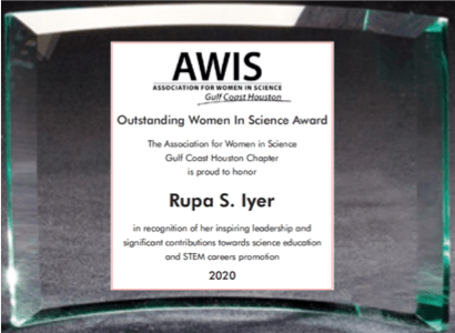 Collaborator. Facilitator. Accelerator. These are just a few words to describe Association for Women in Science Gulf Coast Houston (AWIS GCH) Chapter’s Outstanding Woman in Science 2020 awardee, Dr. Rupa Iyer.