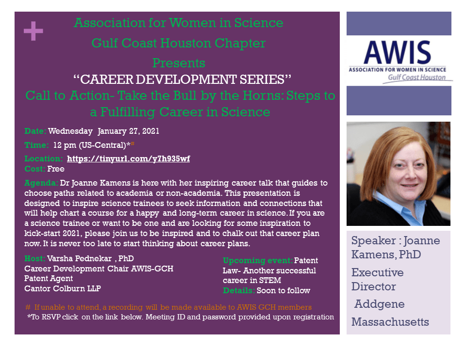 STEM enthusiasts please join us for an inspiring career talk, questioning to choose paths related to academia or non-academia by Dr Joanne Kamens, the current Executive Director at Addgene. This presentation is designed to inspire the science trainees to seek information and connections that will help chart a course for a happy and long-term career in science. If you are a science trainee or want to be one and are looking for some inspiration to kick-start 2021, please join us and chalk out that career plan now. It’s never too late to start thinking about career plans.
