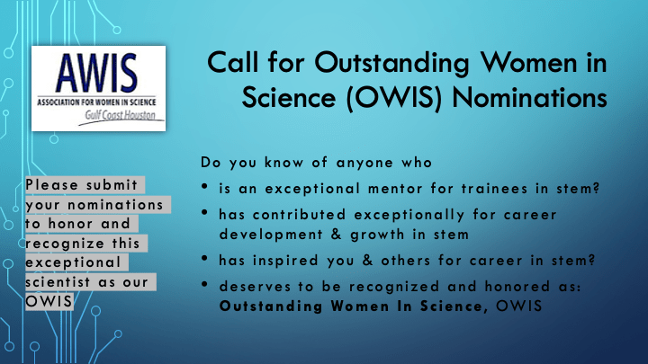 We are excited to plan our Spring 2021 Outstanding Women in Science (OWIS) Seminar, where we recognize an exceptional scientist for their significant and outstanding contribution to STEM. Please submit your nominations on who you would like to be honored this Spring. The AWIS-GCH board will then select our awardee for this year based on your nominations. https://forms.gle/hFnnwr8LDoks3siu8