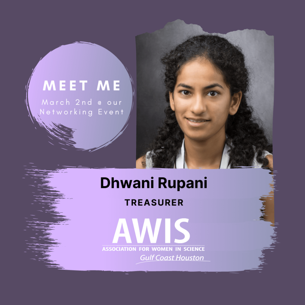 Please join us on March 2nd for a networking happy hour and meet AWIS GCH Treasury: Dhwani Rupani.