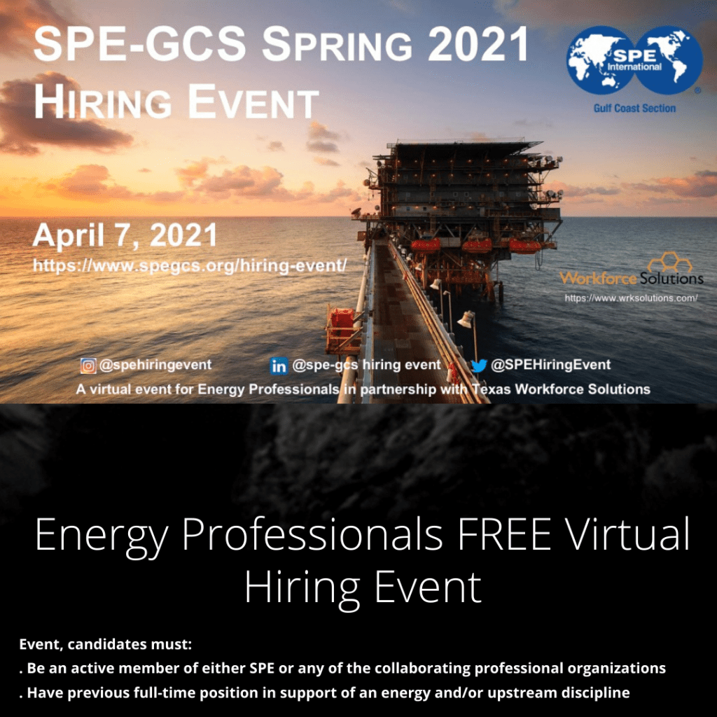 The SPE-GCS is organizing the 8th semi-annual Upstream Oil and Gas Professionals Hiring Event for professionals of energy and upstream oil & gas disciplines. The Hiring Event will be held online and will take place on April 7, 2021.