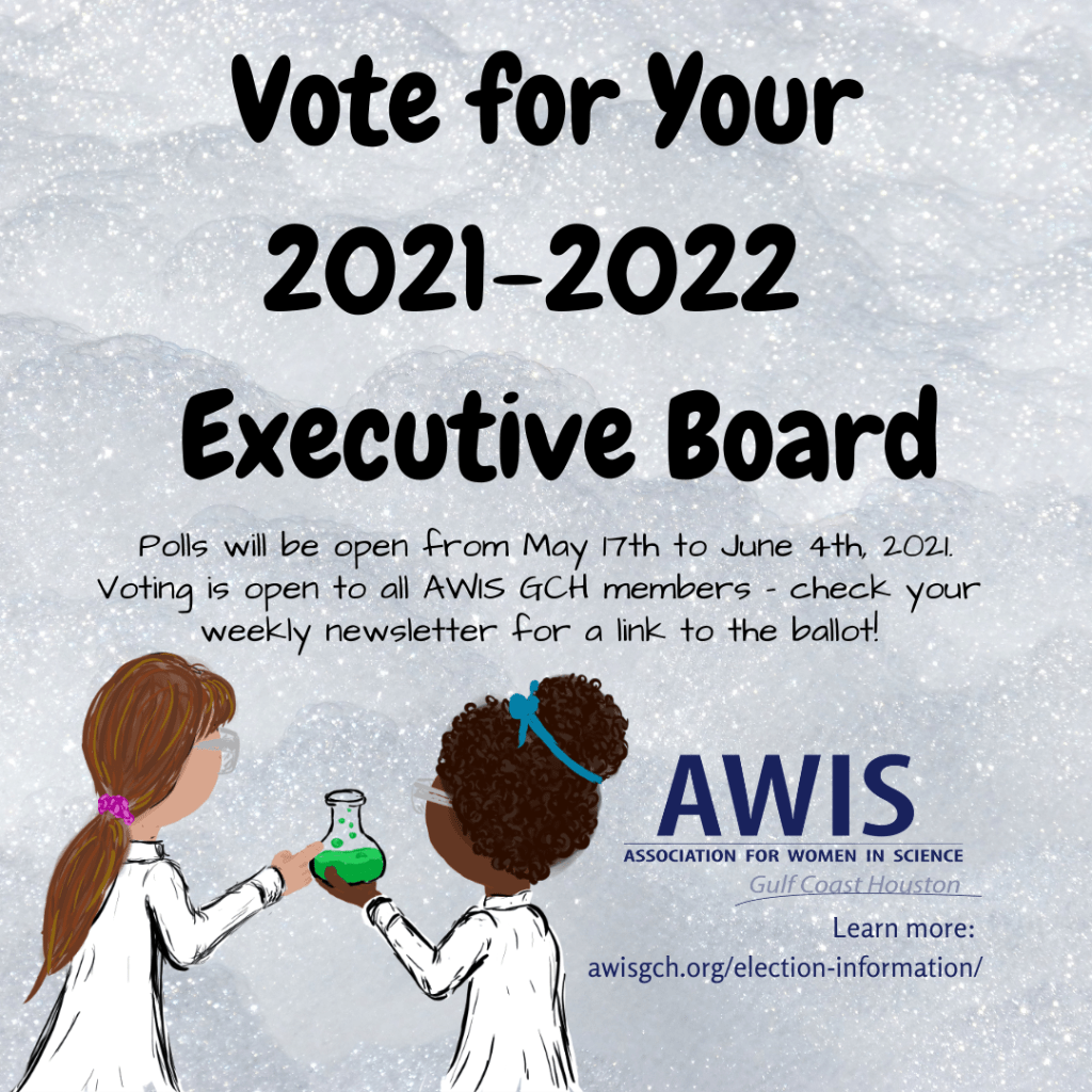 It’s time to vote for your 2021-2022 executive board. Please fill out the form in your member newsletter to cast your vote by June 4th, 2021. You can find candidate statements and position descriptions attached to this email or by visiting https://awisgch.org/election-information/. Only members of AWIS GCH can vote. Winners will be announced on June 7th!