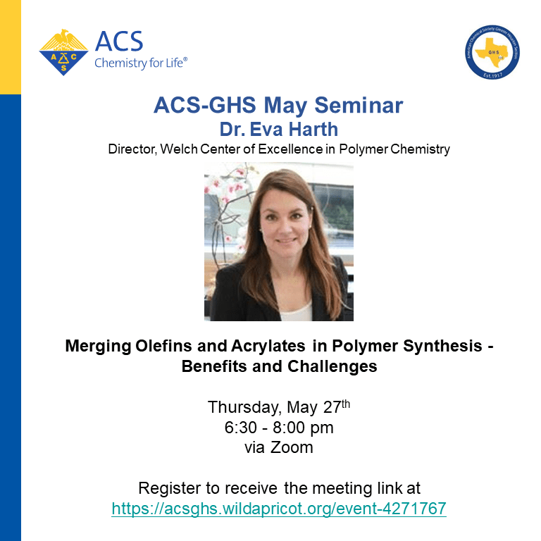 Dr. Eva Harth from the University of Houston will be presenting a seminar entitled “Merging olefins and acrylates in polymer synthesis – Benefits and challenges”. More information and a registration form to receive the Zoom meeting link is at: https://acsghs.wildapricot.org/event-4271767