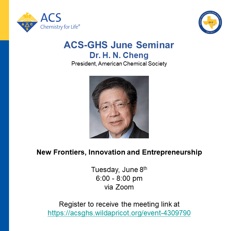 Dr. H. N. Cheng, President of the American Chemical Society will be presenting a talk on New Frontiers, Innovation and Entrepreneurship. Registration is available at: https://acsghs.wildapricot.org/event-4309790