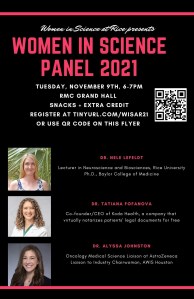 Please join us in career development Women in Science Panel 2021 hosted by Women In Science at Rice University on Tuesday, November 9th, 6-7 PM