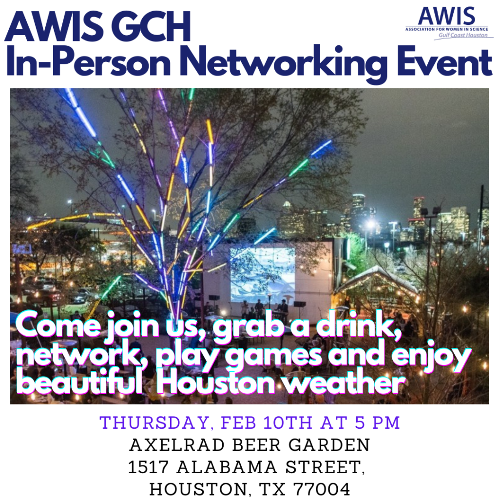 Please join us for our In-Person Networking event to be held on February 10th, 2022 at 5 pm at Axelrad Beer Garden, 1517 Alabama Street, Houston, TX 77004. Come grab a drink or few, play games and enjoy Houston weather while celebrating women in Science !!! #womeninstem #womeninstemm #networking #houstonwomeninstemm #awisgch #awis