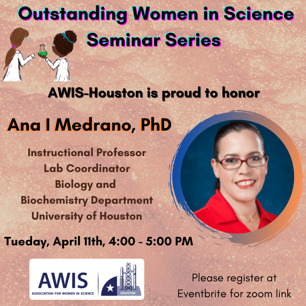 Please join us on April 11th, 4-5 PM for our Outstanding Women in Science (OWIS) Seminar series as we honor Dr. Ana I Medrano for her outstanding contribution to the STEMM field in the Houston area and beyond. Please register at Eventbrite for the zoom link.