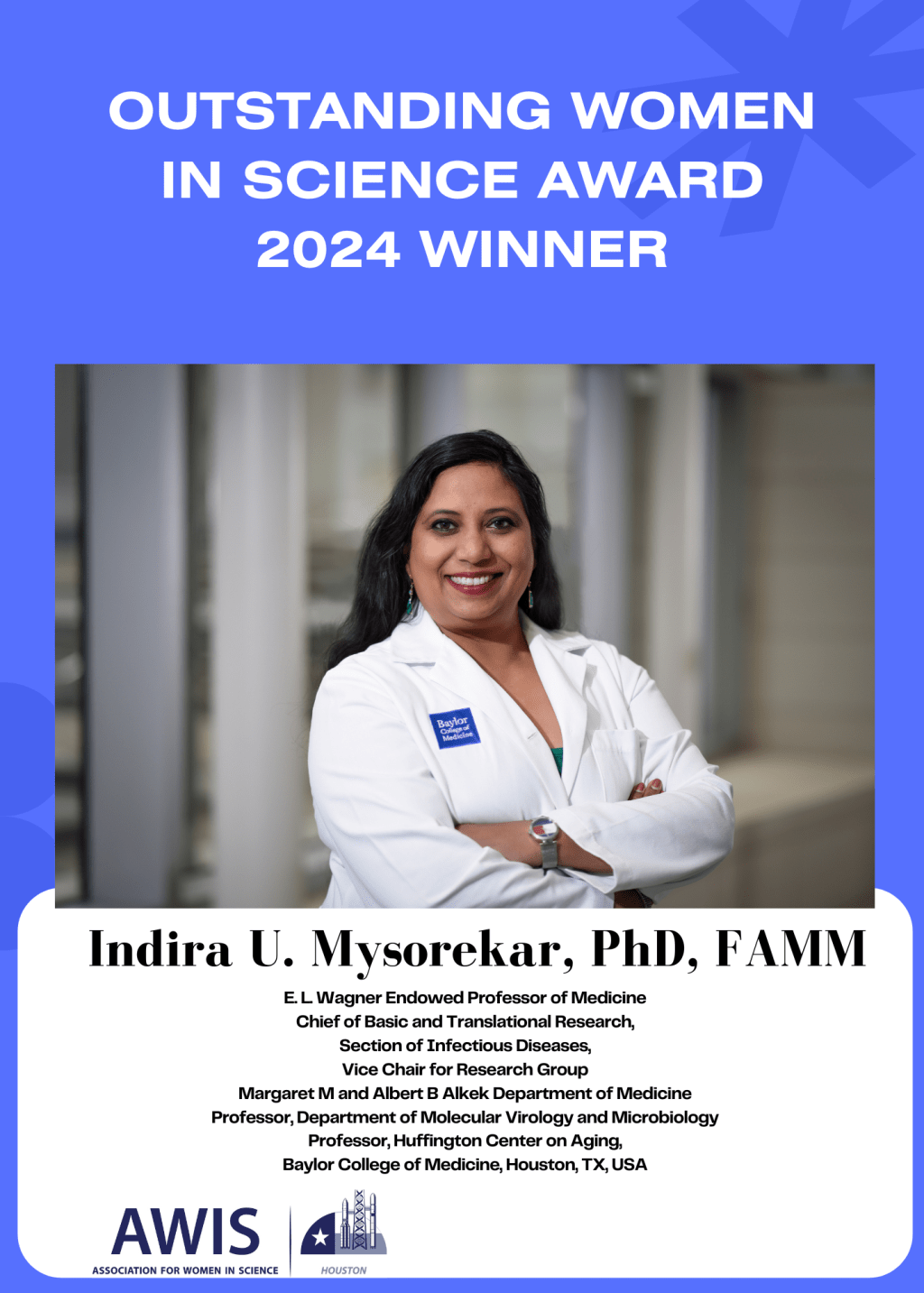 The Mysorekar lab has made a number of novel and paradigm shifting discoveries in urogenital tract immunology, microbiology and microbial pathogenesis. Her research efforts have focused on increasing fundamental understanding of mechanisms underlying viral infections during pregnancy and urinary tract infections in older women and developing targeted therapeutic interventions to improve urogenital health. Dr. Mysorekar has received a K99/R00 award, multiple R01s and program projects from NIDDK/NIA/NICHD/NIAID); Investigator awards from Burroughs-Wellcome Fund and the March of Dimes, the 2021 Christian J. Herr award for outstanding achievements in reproductive immunology and two Endowed professorships: James P. Crane Endowed Professor of Maternal Fetal Medicine and inaugural E.L. Wagner Endowed Professor in Infectious Diseases and most recently been inducted as a Fellow at the American Academy of Microbiology. Come join us virtually to celebrate her journey on April 26th at 5 PM. Please sign up Here to receive the event meeting link. 🎉🎉 This event celebrates the awardee and offers a platform to share her accomplishments and experiences with the wider scientific community. Through recognizing outstanding women in science, with this OWIS award, AWIS Houston aims to increase visibility, representation, and empowerment of women in STEM fields, ultimately enhancing the ongoing progress and excellence of scientific research and innovation.