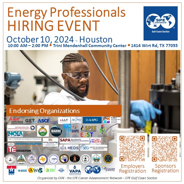 We are excited to announce that AWIS Houston has partnered with the Society of Petroleum Engineers – Gulf Coast Section (SPE-GCS) again for their 15th semi-annual Energy Professionals Hiring Event for professionals of energy and upstream oil & gas disciplines! The Fall 2024 Hiring Event will be held face-to-face on October 10, 2024, at the Trini Mendenhall Community Center located at 1414 Wirt Rd., Houston, TX 77055. See the flyer for more information and to register!