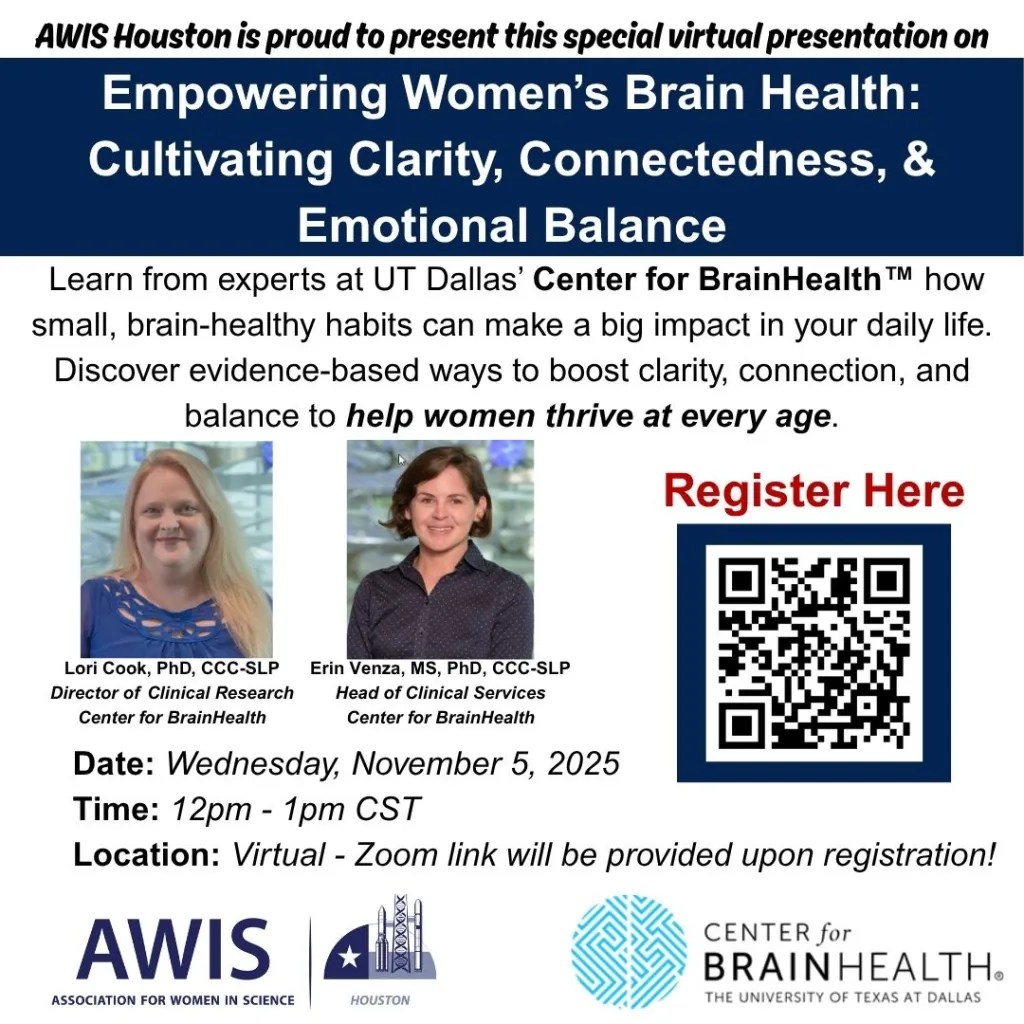 This special event is led by Liz Hileman, Ph.D., President of AWIS Houston, in collaboration with the inspiring scientists and leaders at UT Dallas. Together, we’re advancing conversations that empower women to build lasting cognitive and emotional wellness.